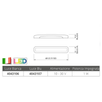 Vodonepropusno IP 65 svjetlo s 4 LED diode, izrađeno od nehrđajućeg čelika AISI 316 sa sjajnom obradom, opremljeno difuzorom koji svjetlost usmjerava prema dolje. Prirodno bijelo ili plavo svjetlo. Pričvršćivanje vijcima. Osjetljiv na polaritet.