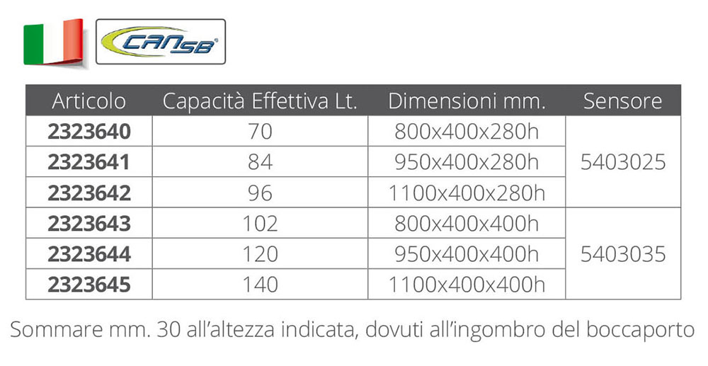 Spremnici za gorivo izrađeni od polietilena zajedno s inspekcijskim poklopcem, priključci za cijev Ø 10 mm. usisna i povratna Ø mm.16. Pogodan za montažu drugog usisnog ili povratnog senzora VDO, SLEEP, itd. Ri.Na. odobren.