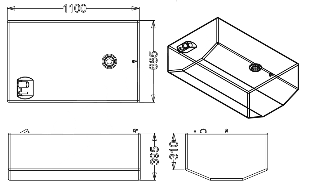 Kruti spremnici za gorivo izrađeni od polietilenskog kolor-neutralnog, imaju CE certifikat u skladu s Direktivom 94/25 / EC prema 10088. Opremljeni su senzorom razine i univerzalnim 10-180 ohmom 240-33 ohm, umetcima za otvaranje Ø mm otvora. Ø 16 mm i plovak. 12. Svaki spremnik se pojedinačno testira.