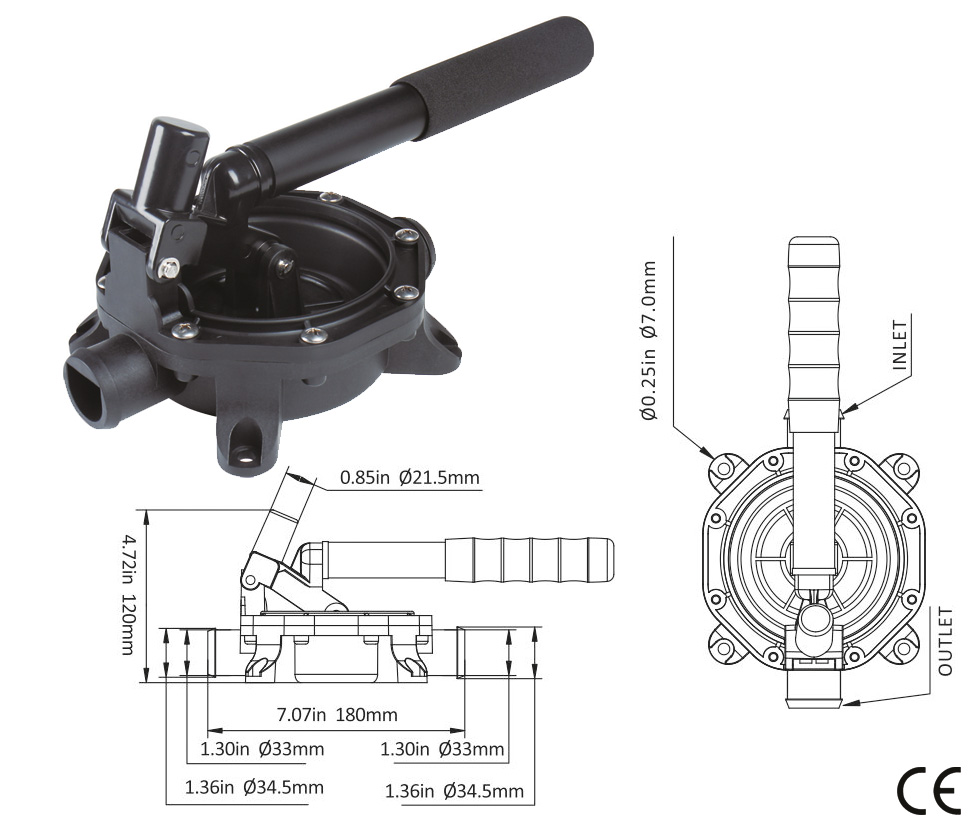 Ručna membranska pumpa s odvojivom aluminijskom ručkom. Kompaktan dizajn i jednostavno održavanje.